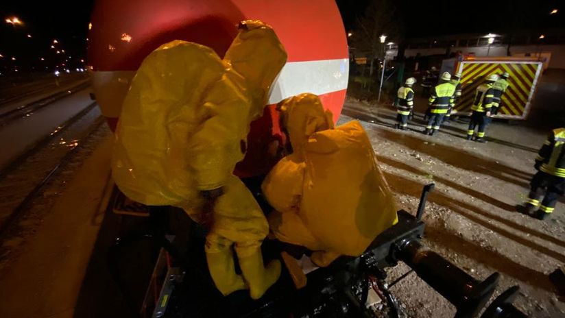Anschließend konnte an den Kesselwagen trainiert werden, diese mit entsprechendem Material abzudichten. Hierbei wurden Chemieschutzanzüge getragen, die das Arbeiten realistisch unter erschwerten Bedingungen, wie in einem realen Schadensfall, darstellten.