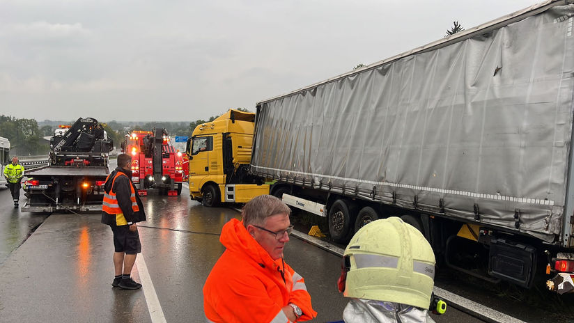 Ein LKW war von der Fahrbahn abgekommen und im nassen Seitenstreifen liegen geblieben. Hierbei wurden mehrere Verkehrszeichen beschädigt. Glücklicherweise blieb der Fahrer des Lastkraftwagens unverletzt.
